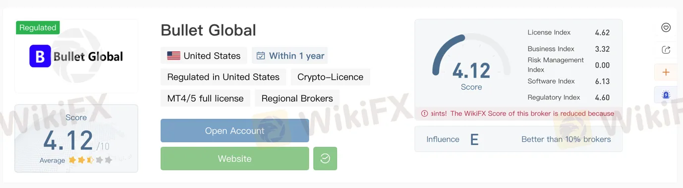 Bullet Global Investment(BGI)是美国的一家交易商。然而根据WikiFX严格的评估,BGI得分并不高,因为它没有含金量较高的牌照来为用户的投资做保证。