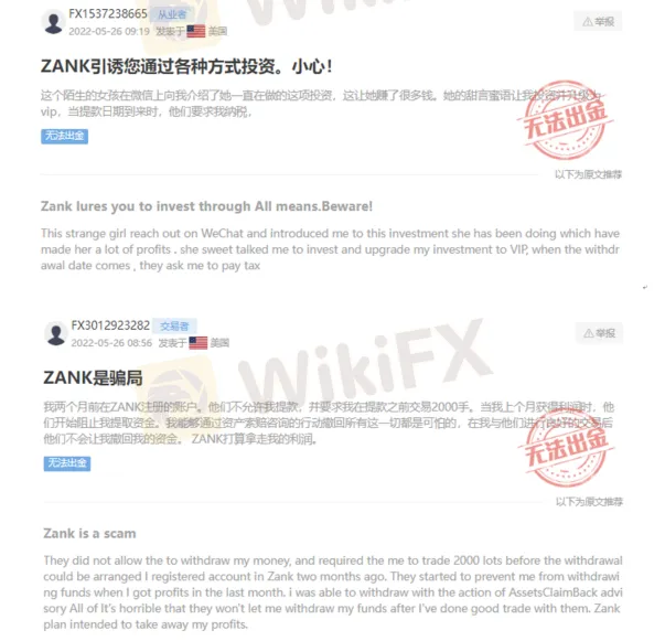 其中一位受害的投资者爆料,最初是有陌生的女孩(ZANK员工)在微信上向他介绍了她自己一直在做投资,并让她赚了很多钱。然后在ZANK工作人员的甜言蜜语下让他投资并升级为ZANK平台的 VIP,但是当提款时,平台却要求他纳税。另一位投资者则表示平台要求他在提款之前交易2000手,但是当他最终获利时却阻止他提取资金。