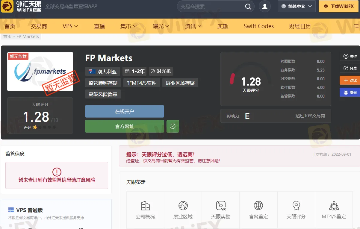 其实有很多方法可以避免出现这样的情况,在做外汇和其他交易之前,可以在我们外汇天眼上面先检索一下该平台是否可靠,就拿FP平台举例,在天眼首页搜索FP可以得出如下结果: