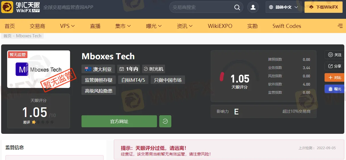 其实有很多方法可以避免出现这样的情况,在做外汇和其他交易之前,可以在我们外汇天眼上面先检索一下该平台是否可靠,就拿Mboxes Tech平台举例,在天眼首页搜索Mboxes Tech可以得出如下结果: