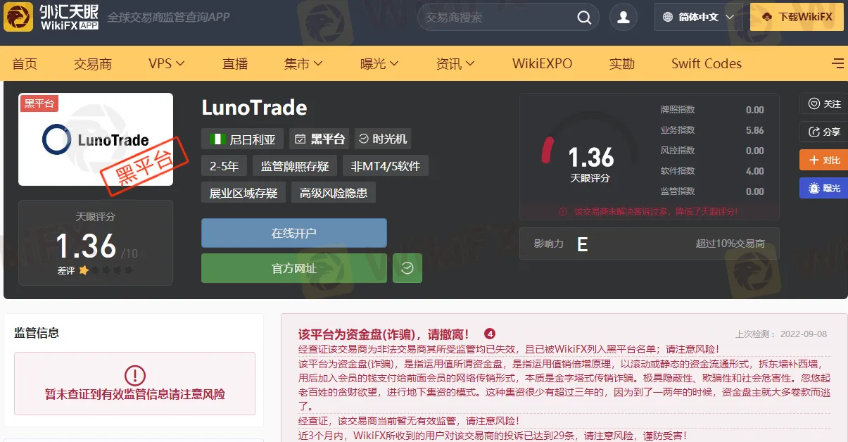 其实有很多方法可以避免出现这样的情况,在做外汇和其他交易之前,可以在我们外汇天眼上面先检索一下该平台是否可靠,就拿LunoTrade平台举例,在天眼首页搜索LunoTrade可以得出如下结果: