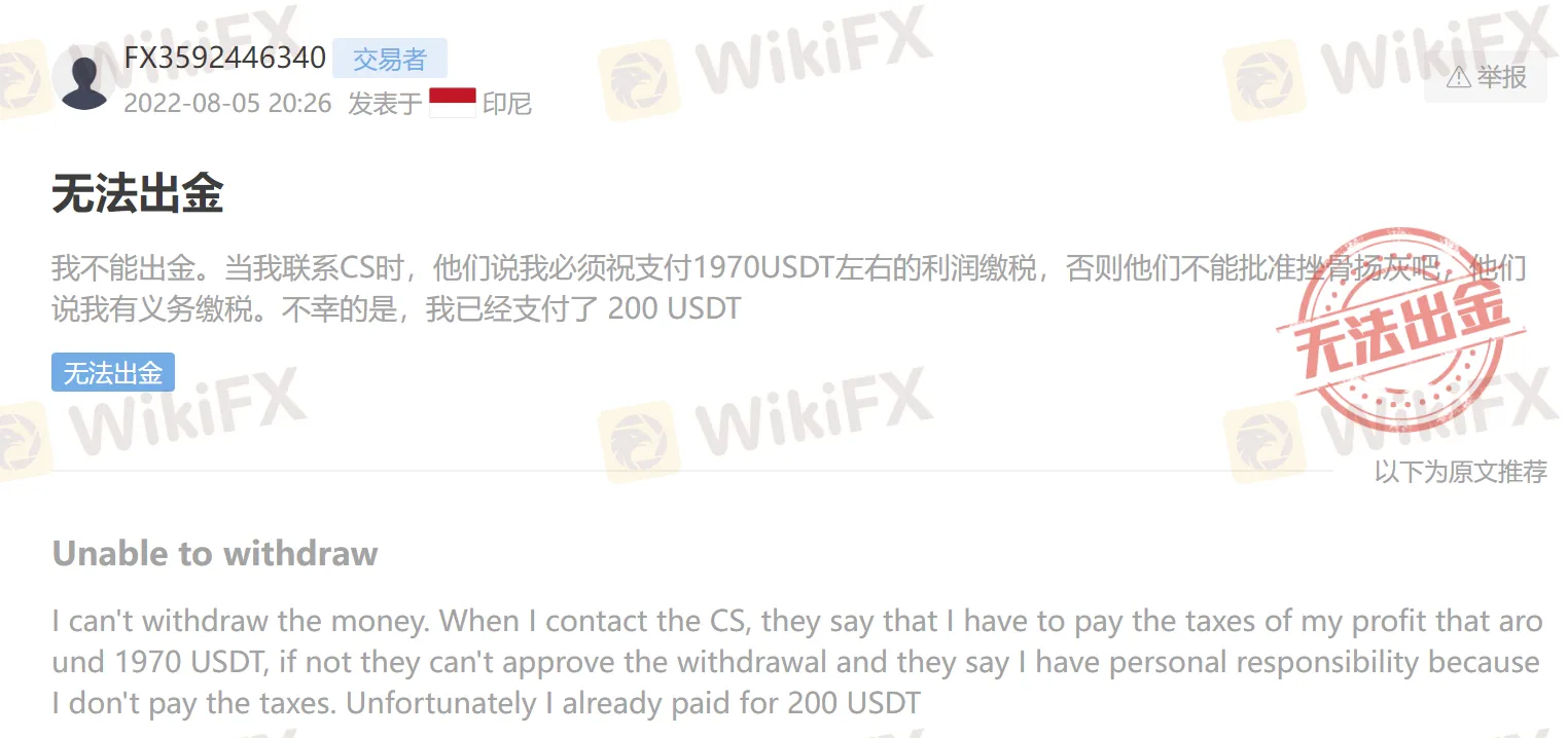 前段时间,一位来自印尼的汇友向外汇天眼爆料,在BKYHYO平台进行交易后,他的资金账户迟迟无法出金。该汇友讲述,在事情发生的第一时间,他就向BKYHYO平台客服人员反应了此种情况。可是平台客服却含糊其辞,且未给出令人信服的回复。不过,随后BKYHYO平台负责人告诉此汇友,他的资金账户存在问题需缴纳200美元的税费。出于急切提现的心理,汇友被迫缴纳了相应的税费。然而,令其感到意外的是,BKYHYO平台又让他缴纳1970美元的费用,并冻结了其账户资金。