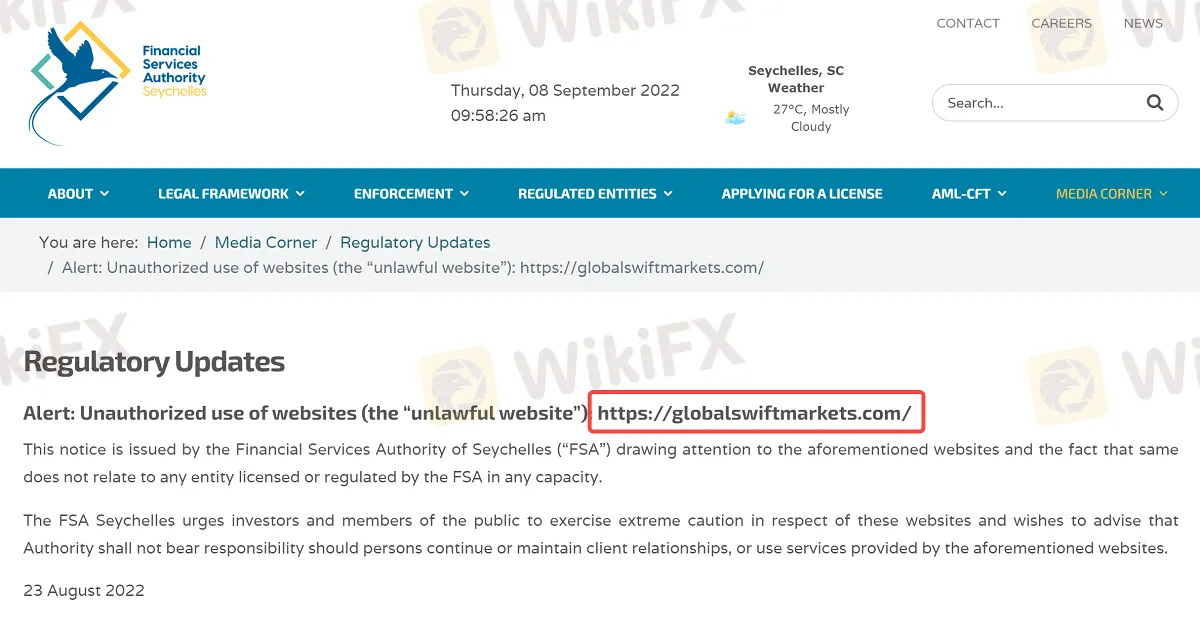 监管方面,在塞舌尔金融服务管理局 (“FSA”)发布警告后,在其官网上已没展示与FSA相关监管信息。但是其声称Globalswiftmarkets™ 是 TopFX Ltd 的商品名,注册号为 HE 274180,注册为塞浦路斯投资公司 (CIF),并由塞浦路斯证券交易委员会 (CySEC) 根据许可证号 138/11、增值税 10274180P 获得许可。金融工具市场指令 (MiFID II)。服务以注册商标 Globalswiftmarkets 品牌提供。