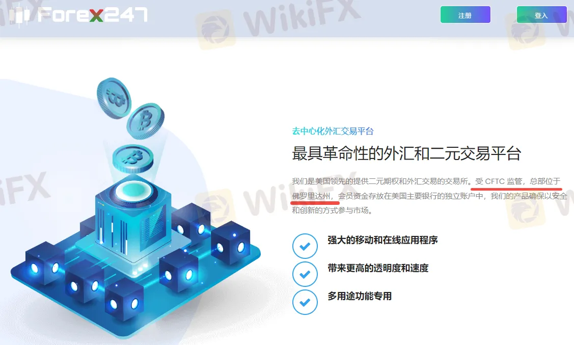 根据其官网介绍,Forex247声称是美国一家提供二元期权和外汇交易的领先交易所。受CFTC监管,总部设在佛罗里达州,会员资金存放在美国主要银行的隔离账户中。投资者可以轻松交易交易股票指数、外汇、商品、二元期权、比特币等。