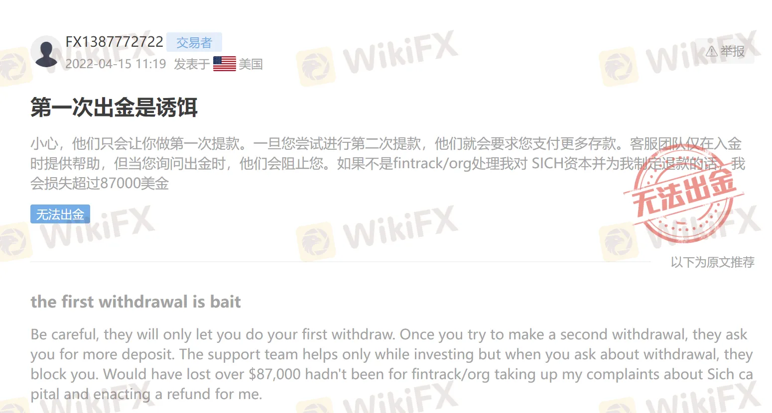 据来自美国的汇友向外汇天眼爆料,一开始在下载SICH交易平台时,SICH客服团队会主动提供帮助;但当交易后准备提现时却遇到了问题。该汇友讲述,SICH账户第一次能够正常提款,可是到了第二次平台就迟迟无法出金。在此期间,SICH客服则告知汇友,需转入更多的存款才可出金。此汇友表示,他向SICH平台询问无法出金的原因时,平台方不仅不给予解释,还阻止其咨询。
