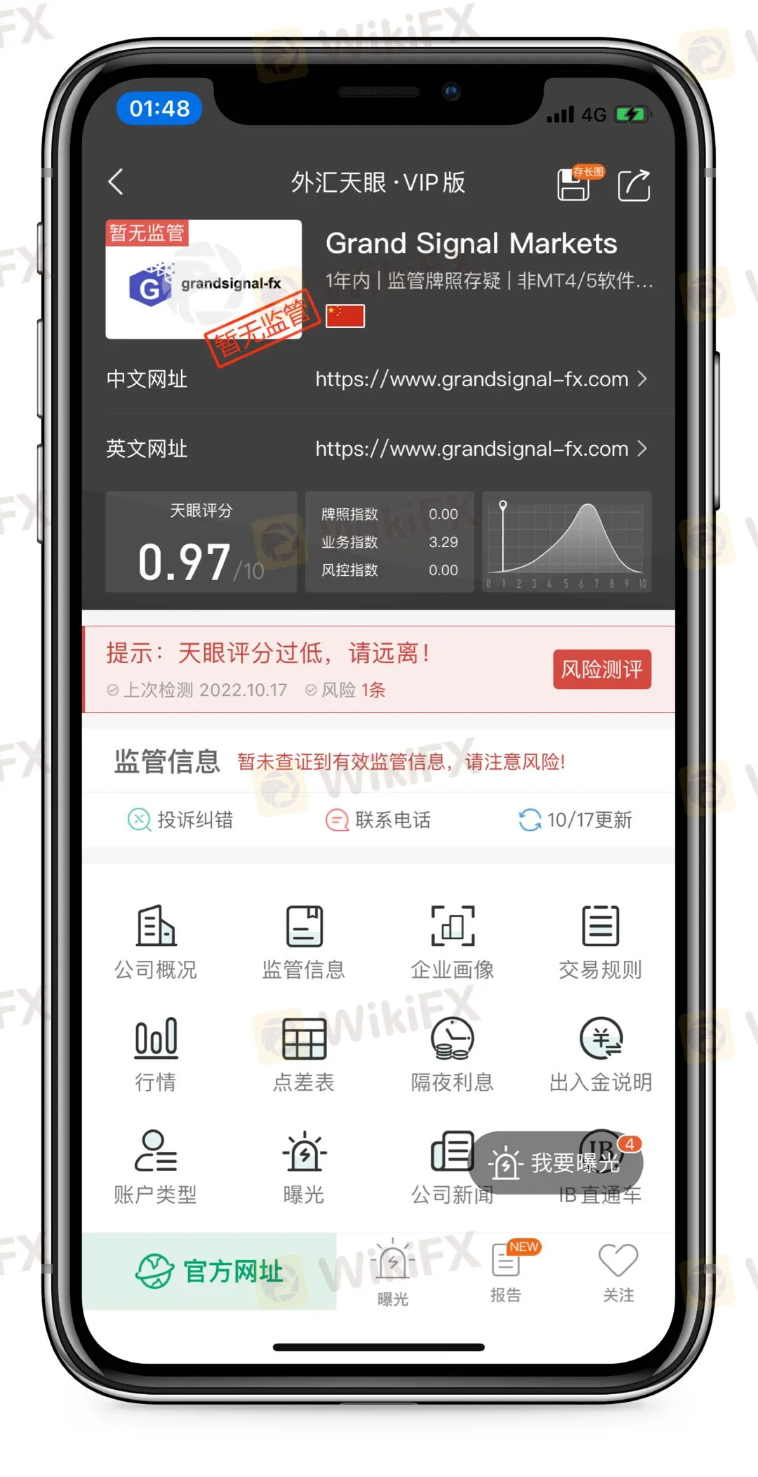 其实有很多方法可以避免出现这样的情况,在做外汇和其他交易之前,可以在我们外汇天眼上面先检索一下该平台是否可靠,就拿Grand Signal Markets平台举例,在天眼首页搜索Grand Signal Markets可以得出如下结果