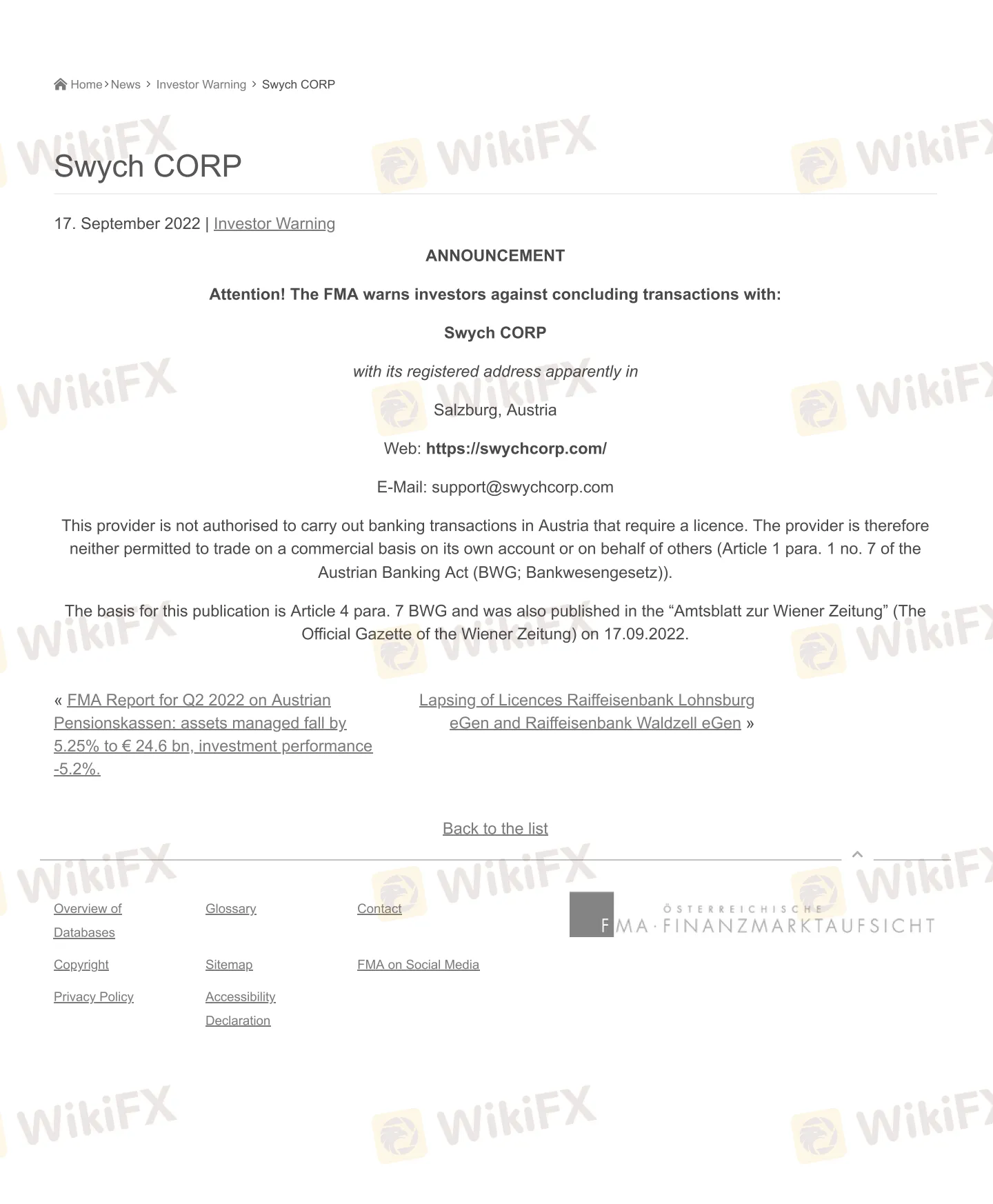 奥地利金融市场管理局(FMA)发布警告称:请注意! FMA警告投资者不要与Swych CORP公司进行交易。