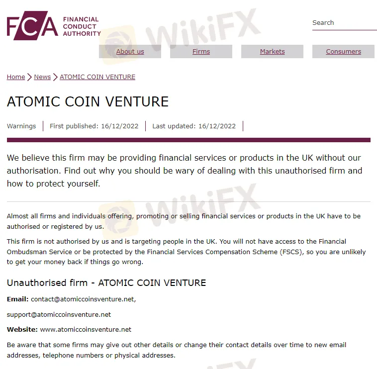 FCA警告称:ATOMIC COIN VENTURE 在未经我们授权的情况下在英国提供金融服务或产品,如果一旦遭受资金损失,您将无法使用金融申诉专员服务或受到金融服务补偿计划 (FSCS) 的保护。