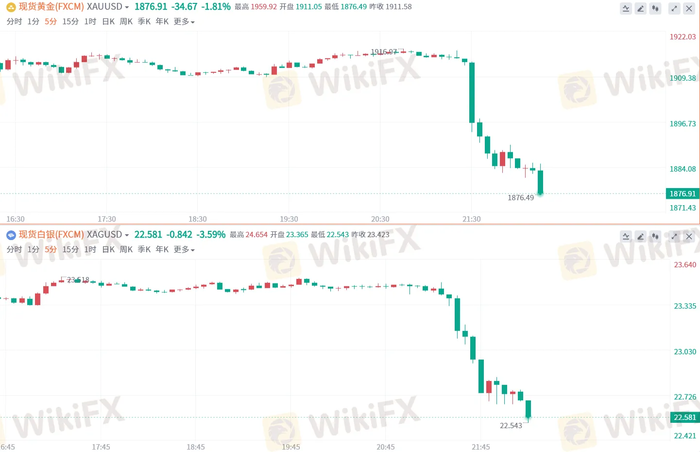 数据公布后,现货黄金失守1880美元/盎司,为1月12日以来首次,较日高回落超38美元;现货白银日内跌超3%,美元指数拉升近100点;非美货币集体下挫,英镑兑美元短线走低110点,欧元兑美元短线走低80点,美元兑日元短线走高160点。