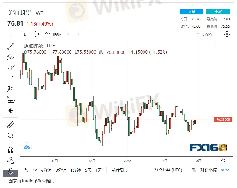 西德克萨斯中质(WTI)原油交易价格上行1.13美元,涨幅1.49%,现报76.81美元/桶。