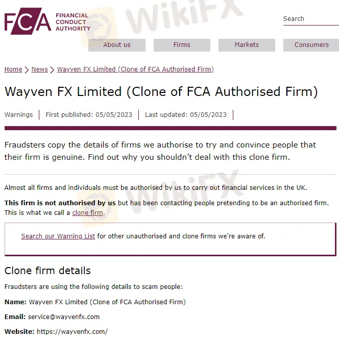 名称: Wayven FX Limited(FCA 授权公司的克隆)