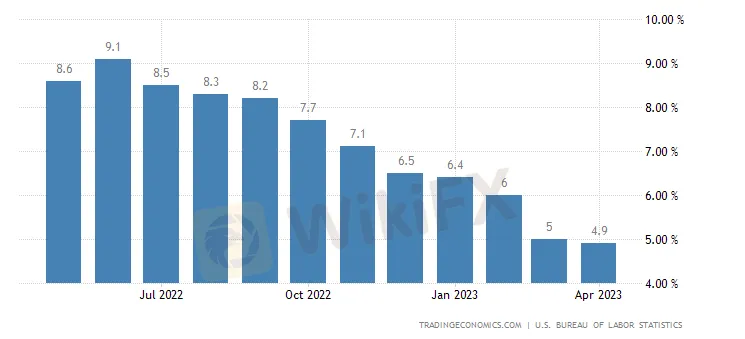 美东时间周三(5月10日),美国4月消费者物价指数(CPI)数据重磅出炉。根据美国劳工统计局的数据显示,美国4月CPI同比涨幅回落至4.9%,预期5%,前值5%,迎来“十连降”且低于预期,环比上涨0.4%。剔除波动较大的食品和能源成本的核心通胀在过去几个月一直居高不下,4月核心CPI同比从上月的5.6%小幅下降至5.5%,环比涨幅为0.4%。数据显示美国4月通胀意外放缓后,美元转跌,美元指数短线下跌逾40点,非美货币持续走高,美股期货拉升。