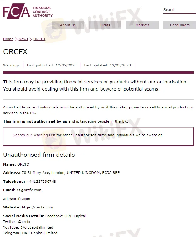 FCA警告称:ORCFX 在未经我们授权的情况下在英国提供金融服务或产品,如果一旦遭受资金损失,您将无法使用金融申诉专员服务或受到金融服务补偿计划 (FSCS) 的保护。
