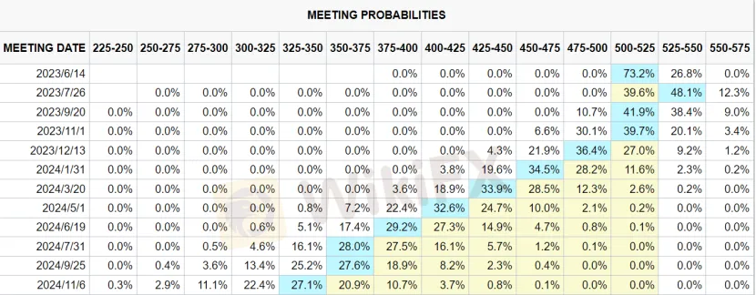 当前,Fedwatch显示,市场预期美联储6月加息25个基点的预期降至26.8%。