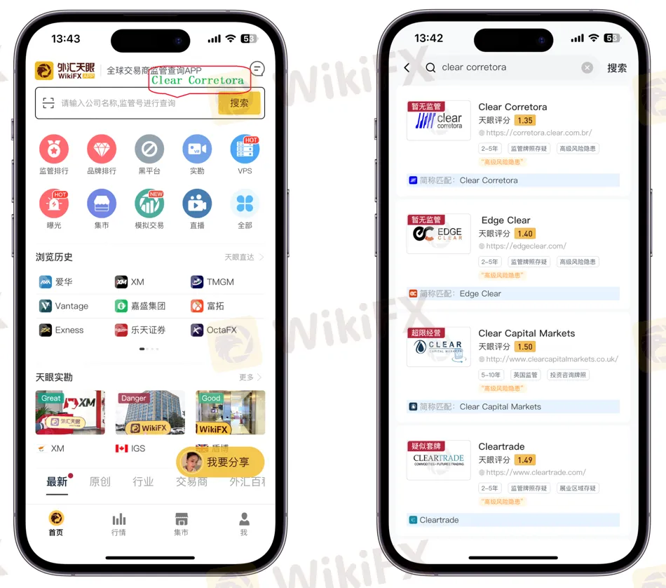 以Clear Corretora为例,在WikiFX首页搜索栏内输入【Clear Corretora】,点击搜索,即可查找出需要查询的交易商。