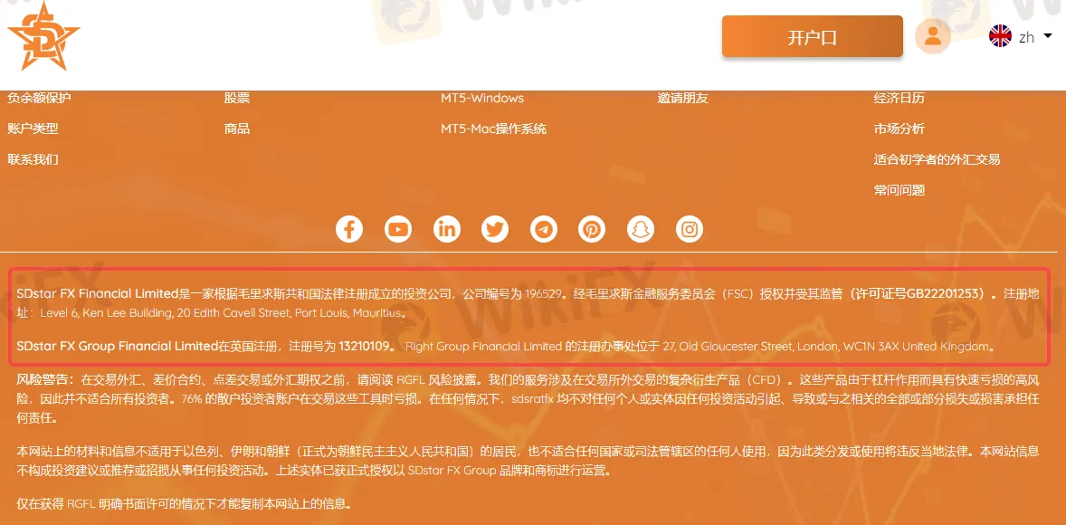 目前,该平台官网仍能够正常访问,这也意味着可能有更多的投资者面临潜在损失。根据其官网介绍,SDSTARFX是一家注册于毛里求斯共和国的投资公司,公司编号为 196529,经毛里求斯金融服务委员会(FSC)授权并受其监管(许可证号GB22201253)。同时也在英国进行注册,注册号为 13210109。