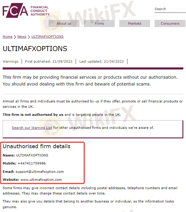 FCA认为ULTIMAFXOPTIONS公司存在欺诈投资者、非法集资等严重违法行为的可能。并警告投资者不要与该公司进行任何交易或投资,如果一旦遭受资金损失,将无法使用金融申诉专员服务或受到金融服务补偿计划 (FSCS) 的保护。