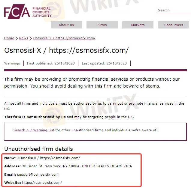 FCA认为OsmosisFX存在欺诈投资者、非法集资等严重违法行为的可能。并警告投资者不要与该公司进行任何交易或投资,如果一旦遭受资金损失,将无法使用金融申诉专员服务或受到金融服务补偿计划 (FSCS) 的保护。