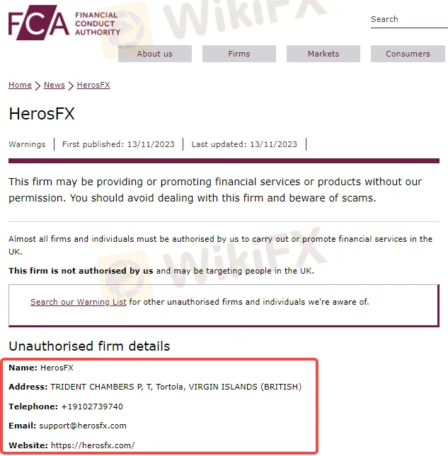 11月13日,英国金融行为监管局(FCA)发布了一则投资者警示公告,公告内容称一家名为HerosFX的公司可能在未获FCA授权的情况下,向投资者非法提供金融服务或产品。