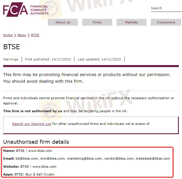 FCA认为BTSE公司存在欺诈投资者、非法集资等严重违法行为的可能。并警告投资者不要与该公司进行任何交易或投资,如果一旦遭受资金损失,将无法使用金融申诉专员服务或受到金融服务补偿计划 (FSCS) 的保护。