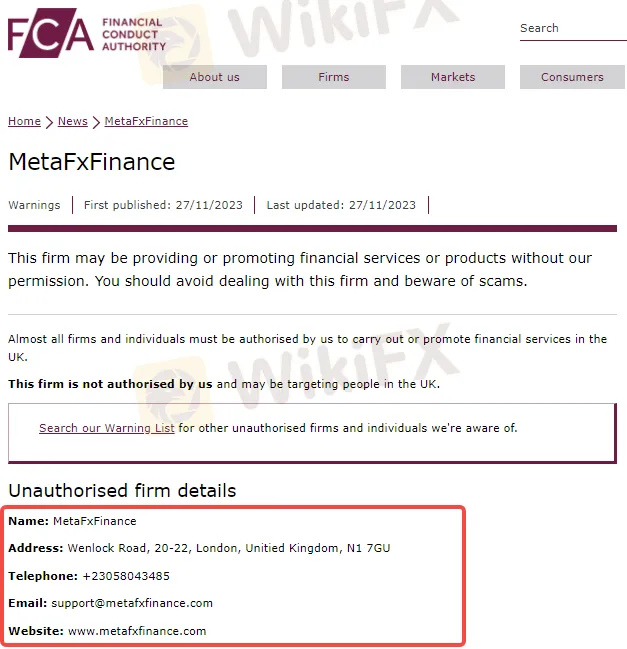 FCA认为MetaFxFinance存在欺诈投资者、非法集资等严重违法行为的可能。并警告投资者不要与该公司进行任何交易或投资,如果一旦遭受资金损失,将无法使用金融申诉专员服务或受到金融服务补偿计划 (FSCS) 的保护。