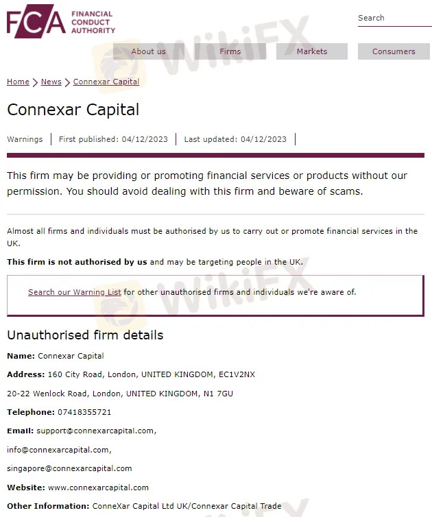 12月4日,英国金融行为监管局(FCA)发布了一则投资者警示公告,公告内容称一家名为“Connexar Capital”的公司可能在未获FCA授权的情况下,向投资者非法提供金融服务或产品。
