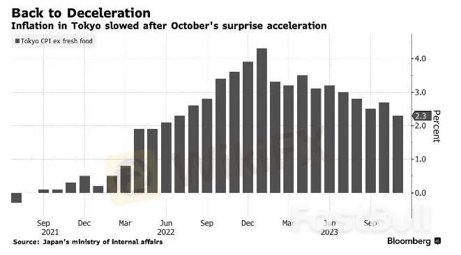 日本内务省周二表示,11月,东京不含生鲜食品的消费者价格(CPI)同比上涨2.3%,主要原因是电力和天然气价格下降,加工食品价格涨幅较小。通胀率较10月份的2.7%有所放缓,低于经济学家预期的2.4%。