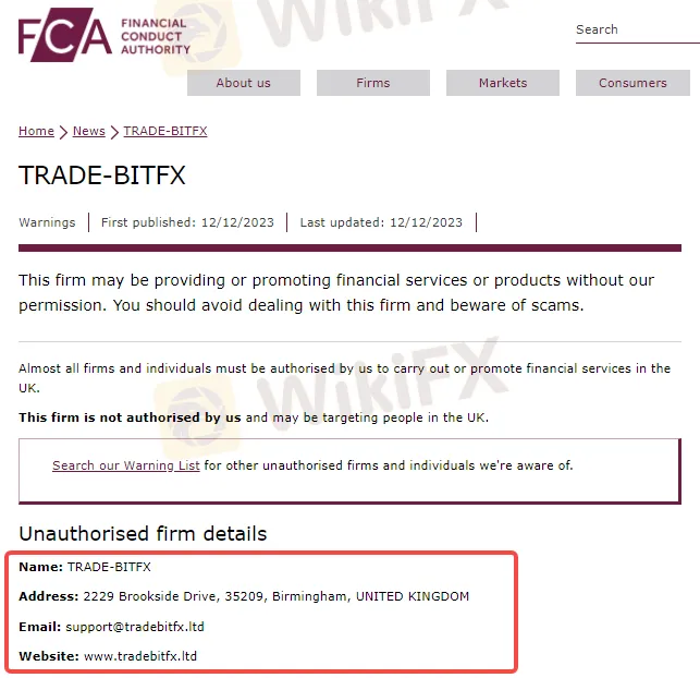 FCA认为TRADE-BITFX存在欺诈投资者、非法集资等严重违法行为的可能。并警告投资者不要与该公司进行任何交易或投资,如果一旦遭受资金损失,将无法使用金融申诉专员服务或受到金融服务补偿计划 (FSCS) 的保护。