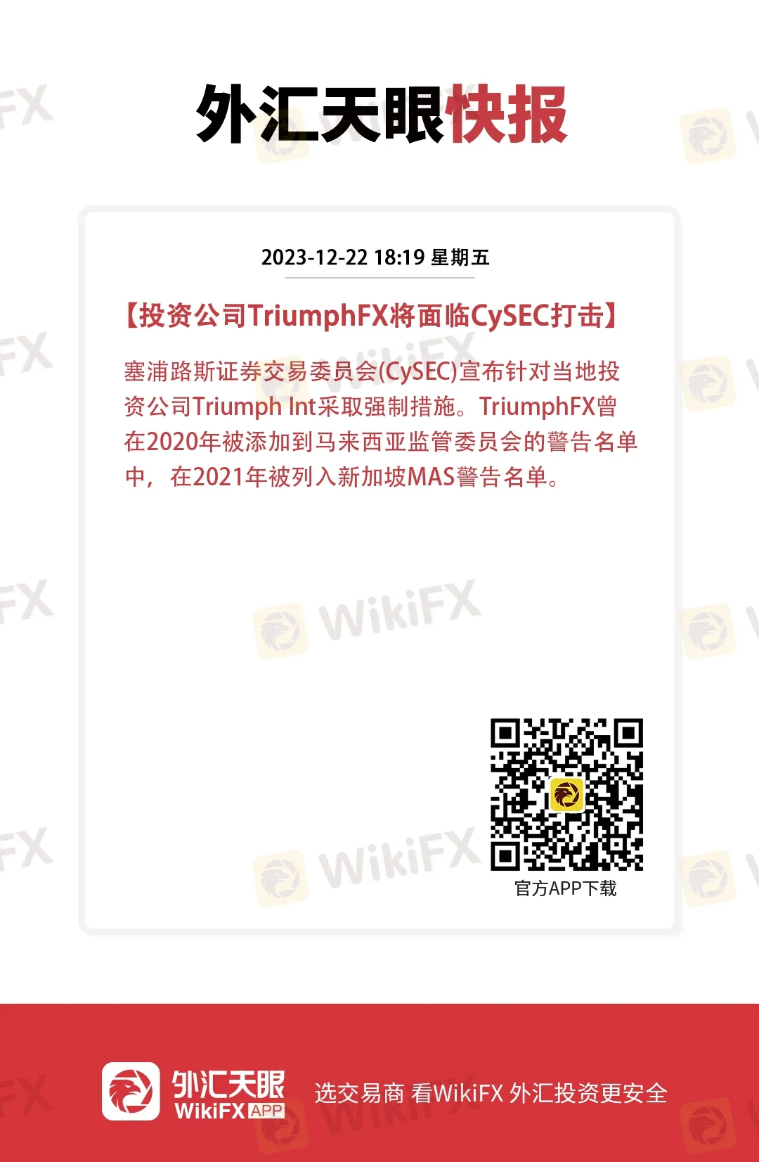 摘要:塞浦路斯证券交易委员会 (CySEC) 宣布针对当地投资公司 Triumph Int. 采取强制措施。TriumphFX 曾在2020年被添加到马来西亚监管委员会的警告名单中,在2021年被列入新加坡 MAS 警告名单。
