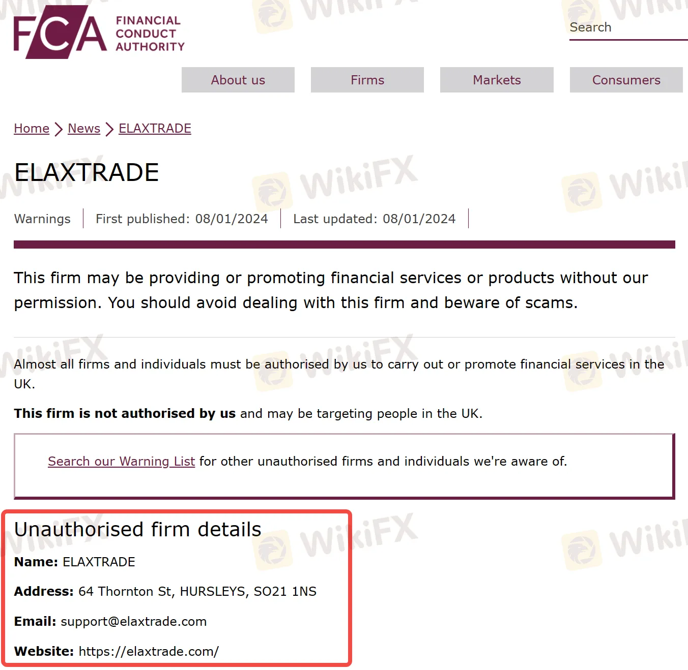 FCA认为ELAXTRADE存在欺诈投资者、非法集资等严重违法行为的可能。并警告投资者不要与该公司进行任何交易或投资,如果一旦遭受资金损失,将无法使用金融申诉专员服务或受到金融服务补偿计划 (FSCS) 的保护。