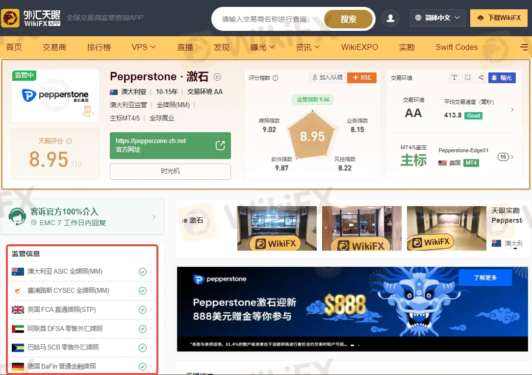 通过外汇天眼查询可知,Pepperstone目前拥有澳大利亚证券和投资委员会(ASIC)全牌照(MM)、塞浦路斯证券交易委员会(CySEC)全牌照(MM)、英国金融行为监管局(FCA)直通牌照(STP)、迪拜金融服务管理局(DFSA)零售外汇牌照、巴哈马证券委员会(SCB)零售外汇牌照以及德国联邦金融监管局(BaFin)普通金融牌照。这也意味着Pepperstone是一个完全合法的经纪人,有义务遵守监管制度。经纪商适用资金保护规则和政策,并提供合格的服务和交易环境,这也会根据相关规定在公司资不抵债的情况下对客户进行补偿。