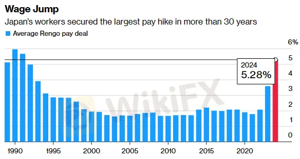 摘要:上周五,日本最大工会联合会Rengo宣布,成员工会今年赢得了5.28%的平均工资涨幅,为1991年以来的最大涨幅。