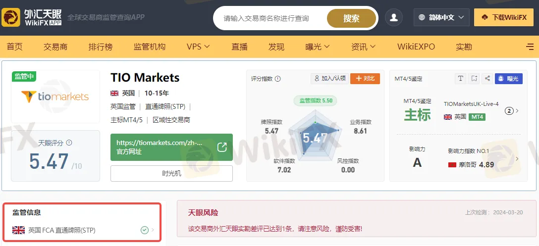 通过外汇天眼查询可知,TIO Markets是在英国金融市场行为监管局(FCA)的监管下运营,FCA是监管交易和投资公司最严格的机构之一。持有英国金融市场行为监管局(FCA)直通牌照(STP)。