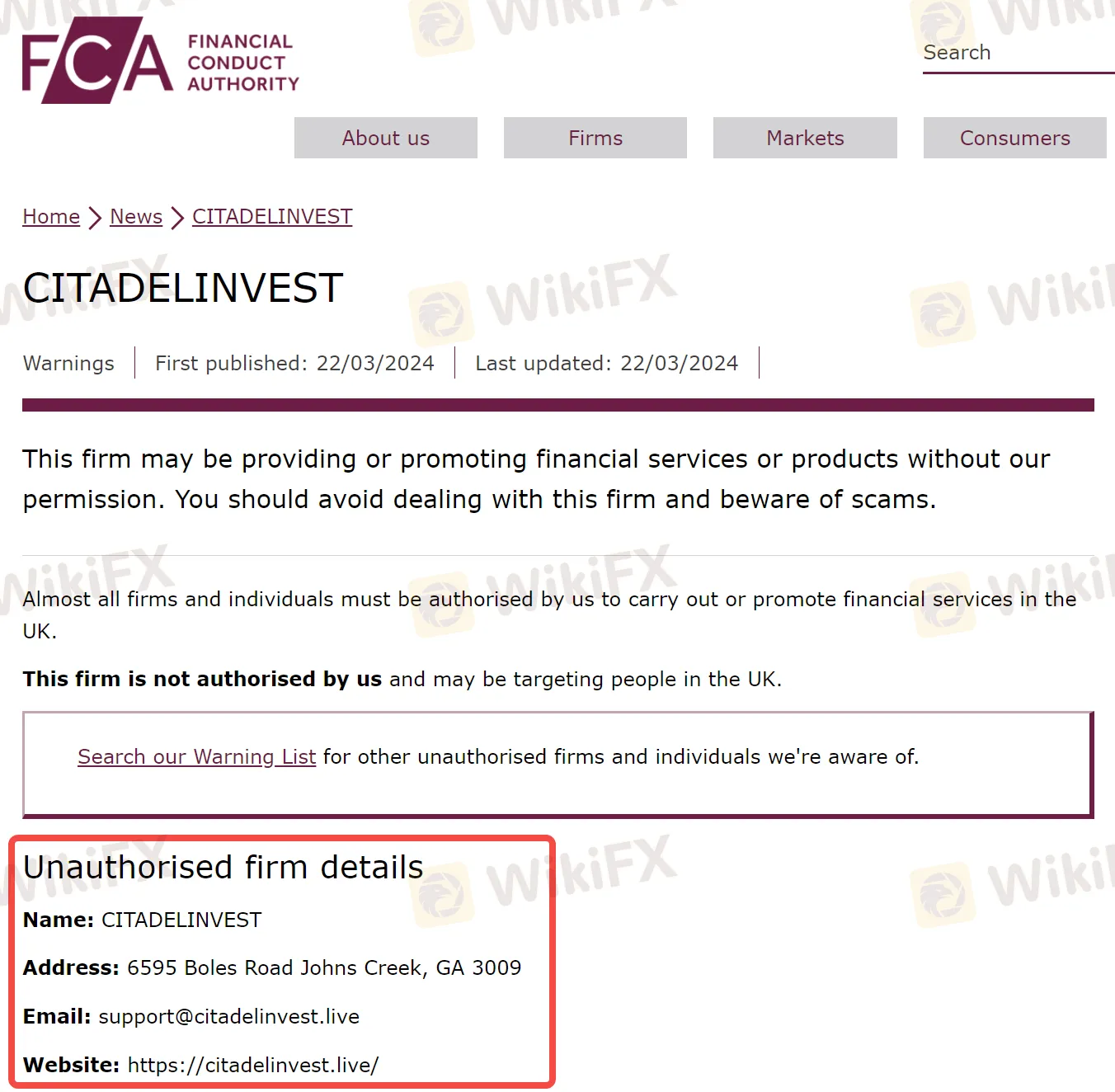 3月22日,英国金融行为监管局(FCA)发布了一则投资者警示公告,公告内容称一家名为CITADELINVEST的公司可能在未获FCA授权的情况下,向投资者非法提供金融服务或产品。