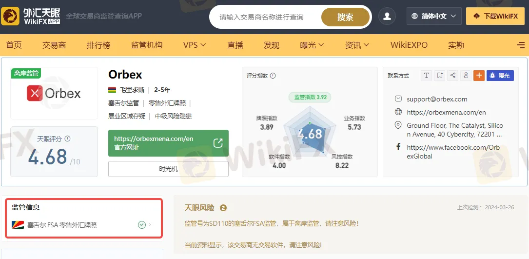 在外汇投资领域,黑平台一直是外汇投资者需要警惕的一大风险,因此选择一家可靠的外汇交易平台显得尤为重要。投资者在选择外汇交易平台时,首要考虑安全可靠性,并明确拒绝选择无监管的平台。监管牌照是评估交易商安全性的重要标准,由监管机构核发,帮助投资者评估交易商的整体实力和信誉。通过外汇天眼查询可知,交易商Orbex目前受到塞舌尔金融服务管理局(FSA)监管,持有FSA颁发的零售外汇牌照。然而,需要注意的是,该交易商的监管号为SD110,属于塞舌尔FSA的离岸监管,投资者应当谨慎对待这种监管形式所带来的风险。尽管受监管是一项重要保障,但投资者仍需全面了解监管情况并做好风险管理,以确保自身利益和资金安全。