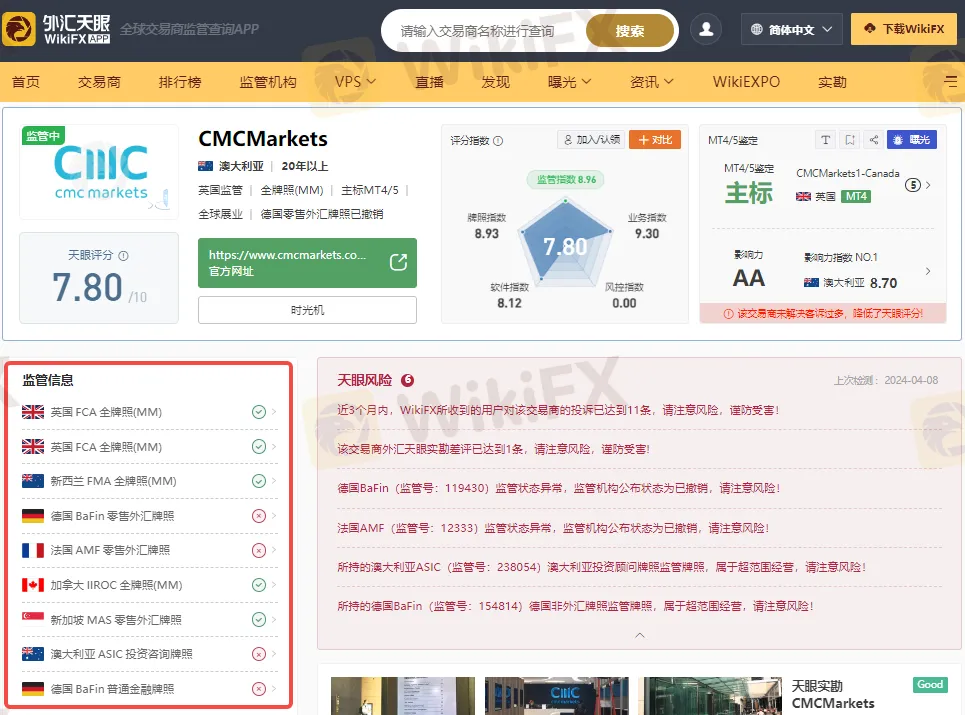 通过外汇天眼查询可知,CMC Markets目前受到英国金融行为监管局(FCA)和新西兰金融市场管理局(FMA)等监管。持有英国金融行为监管局(FCA)全牌照(MM)、新西兰金融市场管理局(FMA)全牌照(MM)、加拿大投资行业监管组织(IIROC)全牌照(MM)、新加坡金融管理局(MAS) 零售外汇牌照、澳大利亚证券和投资委员会(ASIC)投资咨询牌照以及德国联邦金融监管局(BaFin)普通金融牌照。其中所持的澳大利亚ASIC(监管号:238054)澳大利亚投资顾问牌照监管牌照,以及所持的德国BaFin(监管号:154814)德国非外汇牌照监管牌照,属于超范围经营,请注意风险!