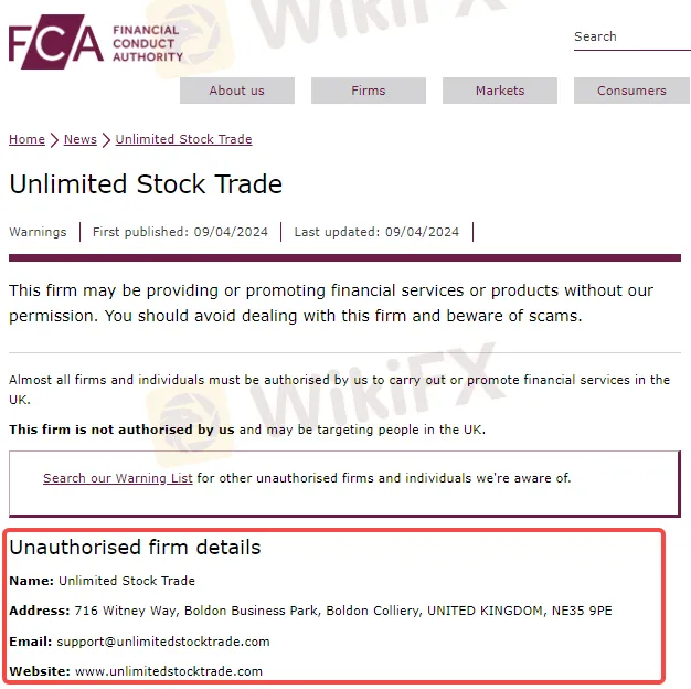4月9日,英国金融行为监管局(FCA)发布了一则投资者警示公告,公告内容称一家名为Unlimited Stock Trade的公司可能在未获FCA授权的情况下,向投资者非法提供金融服务或产品。