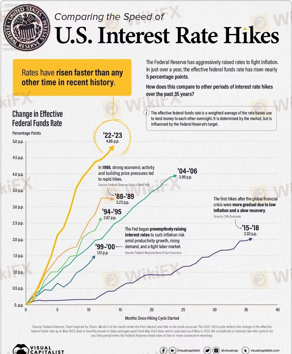 美联储自20世纪70年代大滞胀时期至今,已历经九轮加息周期。这些加息举措多数旨在应对经济过热和抑制高通胀水平,而仅有1994年和2015年的加息周期是为了逐步退出宽松货币政策,以回归正常的政策利率区间。