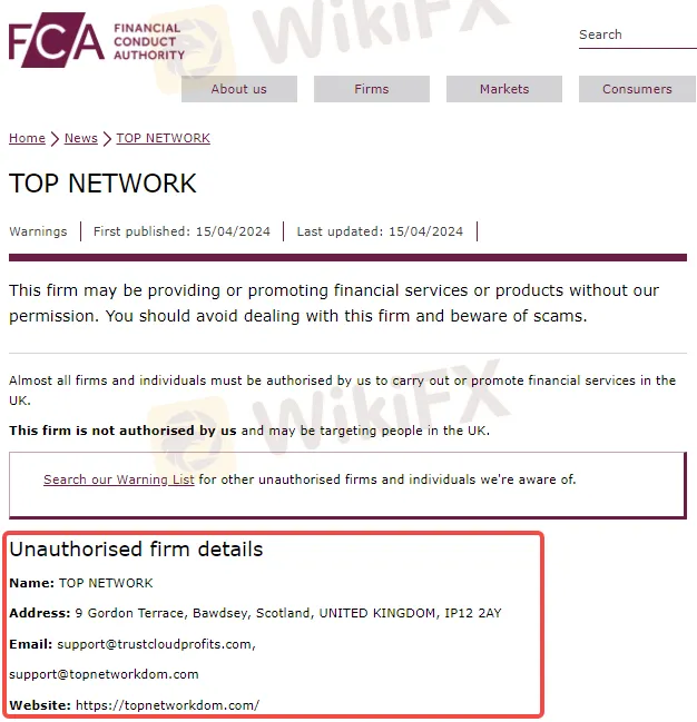 FCA认为TOP NETWORK存在欺诈投资者、非法集资等严重违法行为的可能。并警告投资者不要与该公司进行任何交易或投资,如果一旦遭受资金损失,将无法使用金融申诉专员服务或受到金融服务补偿计划 (FSCS) 的保护。