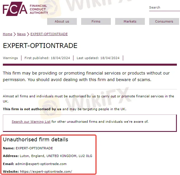 FCA表示,根据英国法律,几乎所有在英国境内提供、推广或销售金融产品或服务的公司和个人,都必须获得FCA的正式授权许可。但据FCA调查,EXPERT-OPTIONTRADE从未获得过FCA的任何形式的金融业务许可。