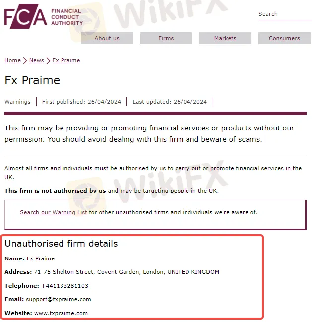 FCA认为Fx Praime存在欺诈投资者、非法集资等严重违法行为的可能。并警告投资者不要与该公司进行任何交易或投资,如果一旦遭受资金损失,将无法使用金融申诉专员服务或受到金融服务补偿计划 (FSCS) 的保护。