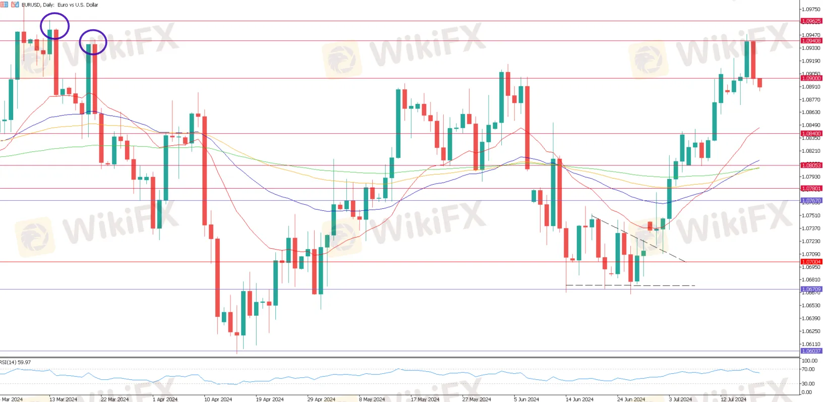 通过六月末开始至今的这波上升行情划分出的斐波那契回调来看,如果欧元兑美元出现回调,该回调支撑可看在 23.6% 和38.2% 的回调线上,分别是1.0880 和1.0840附近。