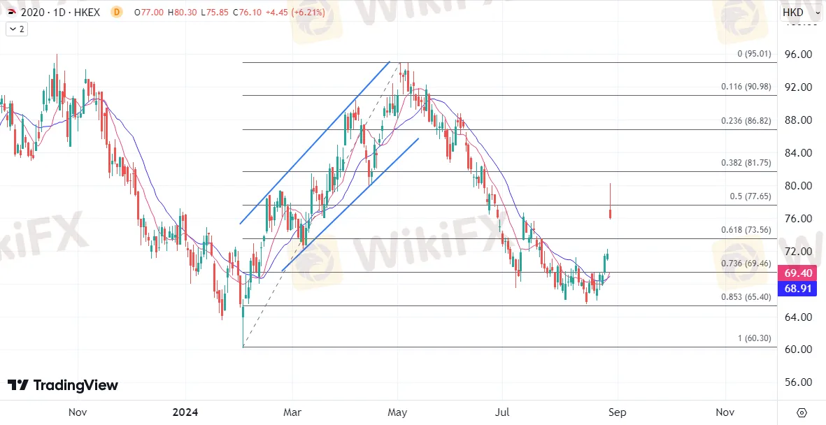 即便是在消费市场依然处于增长欠佳的状态下,国产运动品牌多数步入“调整期”的增速放缓,多品牌布局的安踏仍实现“全面开花”,零售额同比实现增长,带动了上半年的营利双增,录得最佳半年业绩,而推进百亿元回购计划更是带动市场对于集团业绩和股价前景的信心,而业绩显示安踏正在加大运动科技研发,有望继续通过优化产品性能带来更大的市场份额。当前股价在短暂测试80港元后回吐,若日内收低于76港元,则留意可能进一步回撤至75-70港元范围。