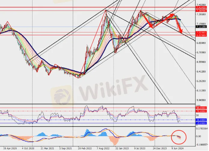美元兑人民币周线级别震荡下行,随着中美利差的缩小,人民币资产相对于美元资产的回报率优势逐渐显现。这不仅包括债券市场,还涉及其它人民币计价的金融资产。较高的回报率吸引了大量国际资本流入中国市场,进一步支撑了人民币的价值。