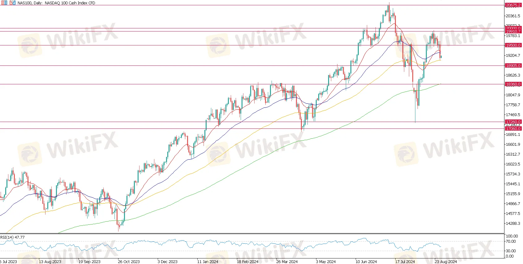 从NAS100 走势可见,7月份期间出现的暴跌于8月初出现迅速反弹,但这一现象时出现于近历史高点,并在近期受阻于20,000 点的水平,是否可能预示NAS100上行很可能在未来一段时间内受到抑制?