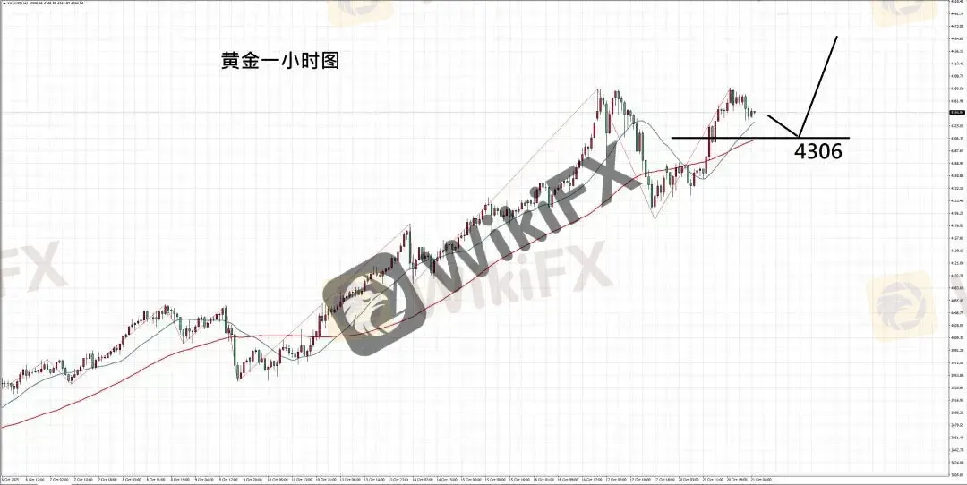 摘要:【基本面分析】美国政府停摆已进入第20天,官方经济数据中断,市场焦点转向政经消息。特朗普警告,若中美未能在11月初前达成协议,美国将对中国商品征收高达155%的关税。尽管双方近期传出恢复会谈的意愿,但贸易紧张情绪仍主导市场,避险需求持续升温。与此同时,利率期货显示市场对10月降息的预期高达99%,在宽松预期与避险情绪的双重支撑下,黄金价格持续攀升。【技术分析】黄金一小时图,走势回测支撑后回升,并刷