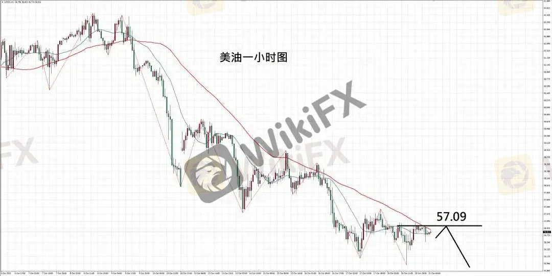 美油一小时图,走势向下跌破前期低点,高低点持续下降,反映卖压增强;如后续反弹受阻,则走势或继续向下,故建议短空操作。
