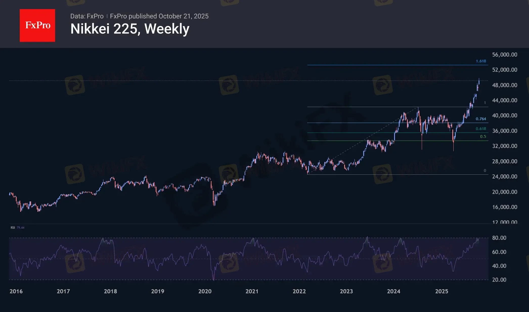 从周线级别来看,日经225指数的相对强弱指数(RSI)已接近但尚未进入超买区域。过去10年间,当该指数接近80时,上涨行情后往往会出现大幅回调,而目前指数处于75的水平。总体而言,这些数值已相对较高,但在这种情况下,上涨行情往往会走向极端,迫使提前卖出的投资者平仓离场。日经225指数涨至5.2万至5.3万点区间并不足为奇,这一水平更接近日本股市近年来的典型上涨区间,且对应着截至2024年年中1.5年上涨幅度的161.8%斐波那契扩展位。