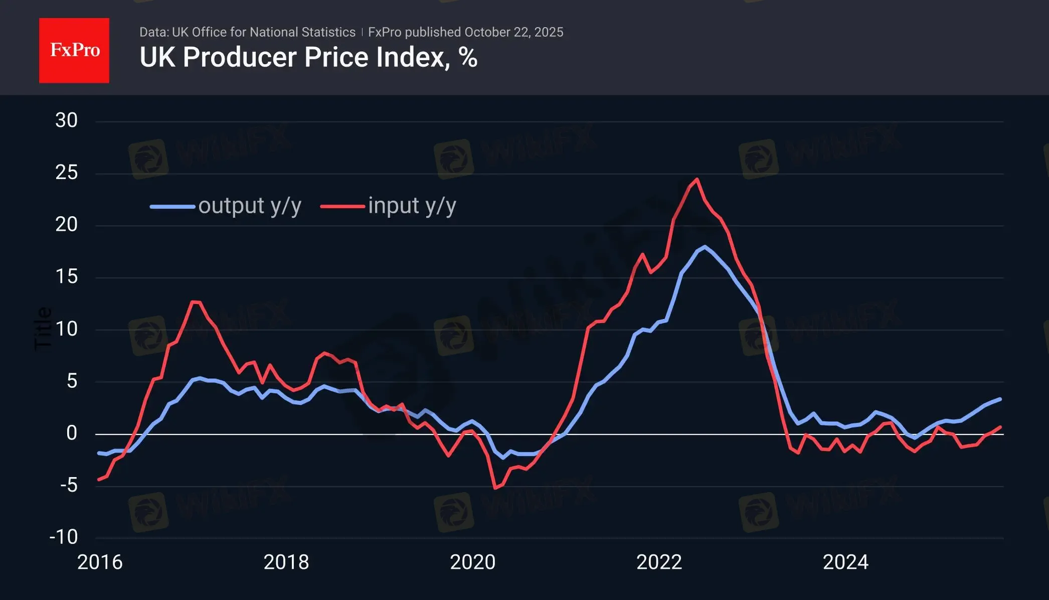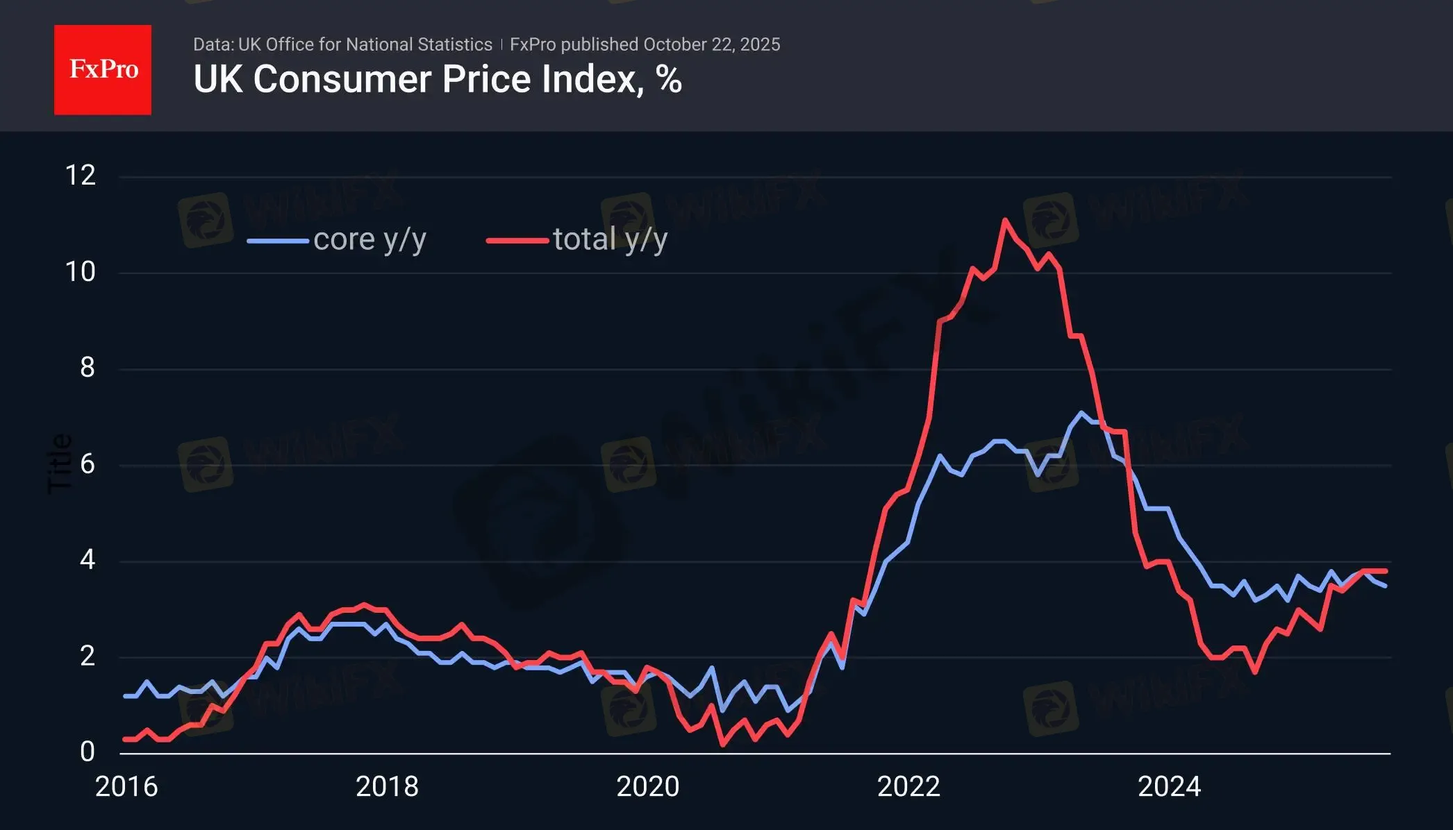 摘要:注:此文章由FxPro高级分析师Alex Kuptsikevich撰写在长时间暂停发布相关数据后,英国公布了一整套通胀指标,整体结果比预期更为疲软,这给英镑带来了更大压力,同时也让股市逆势上涨。9月,消费者价格指数(CPI)与之前持平,年增长率维持在3.8%,与市场预期的加速升至4.0%相反。核心消费者价格指数年同比放缓至3.5%,8月和7月该指数分别为3.6%和3.8%。不确定性的一大关键因素在