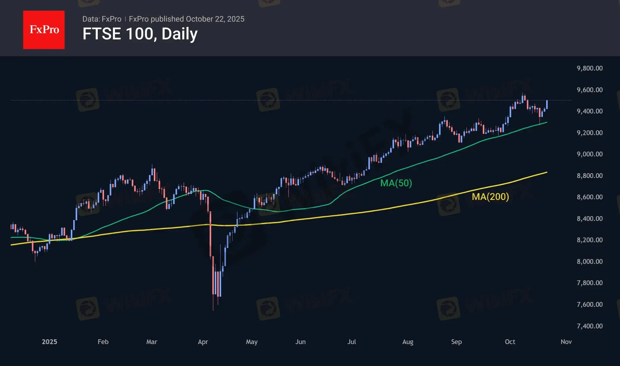 以富时100指数为代表的英国股市自当日开盘以来已上涨1%,其中0.9个百分点的涨幅出现在数据公布之后。该指数重返9500点上方,此前仅在10月8日收盘时站上过这一关口。上周五,市场在触及50日均线后出现强劲反弹,该均线自5月以来始终扮演着支撑位角色。英镑走软为股市提供支撑,这源于市场对货币政策宽松的预期不断升温。目前英国股指距历史高位仅剩1%的差距,最快可能于本周内再创新高。